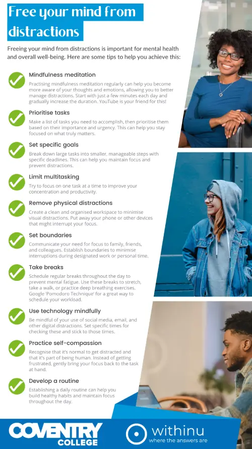 However, the content is not intended to serve as specific mental health advice or replace consultation with a trained professional. If you or someone you know requires personalised mental health support, we strongly encourage you to consult with a licensed mental health professional, contact the College Wellbeing Coaches or seek appropriate services in your area.
